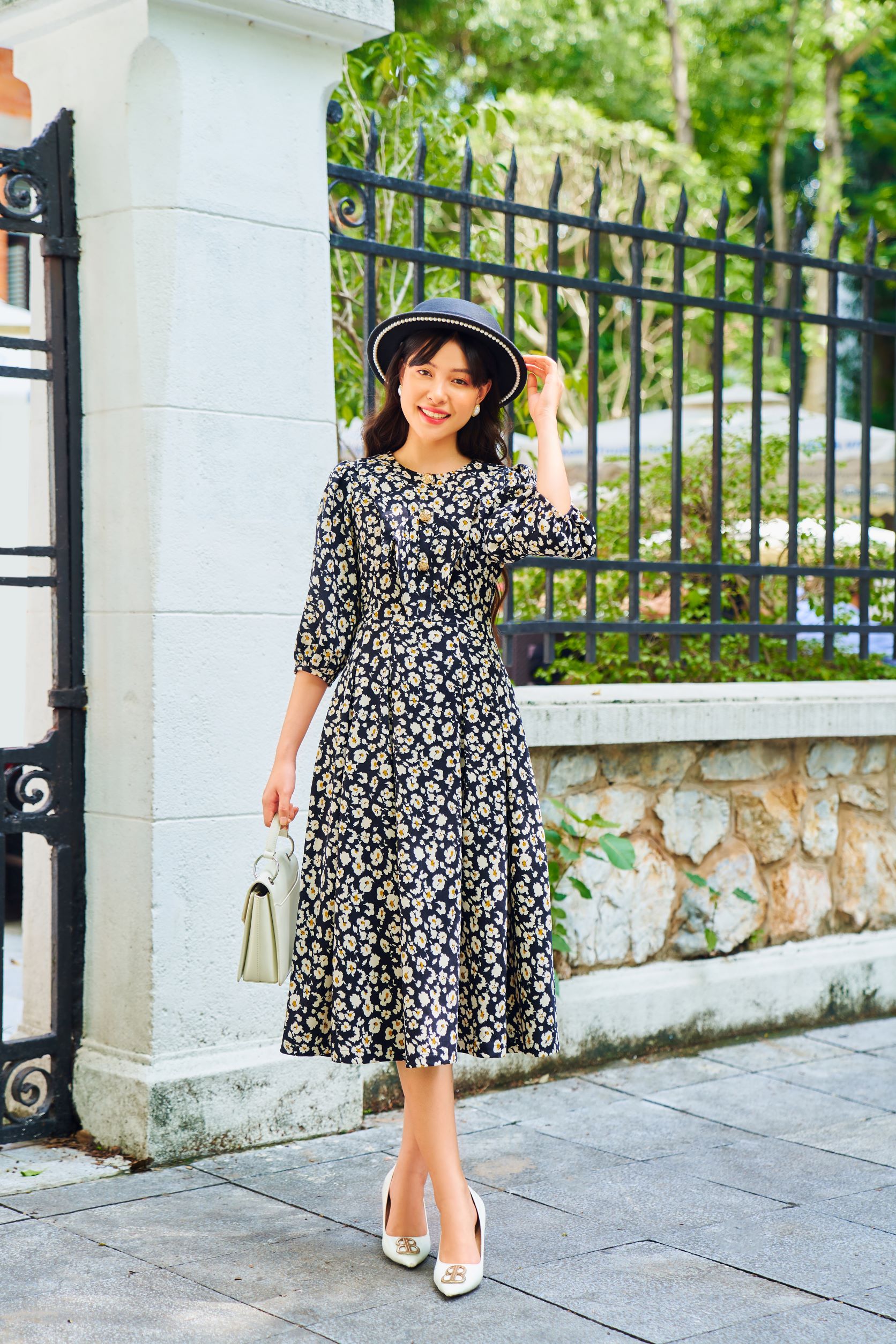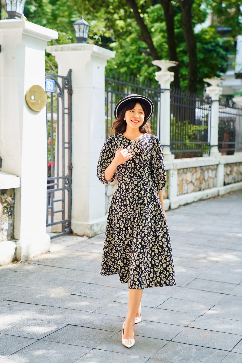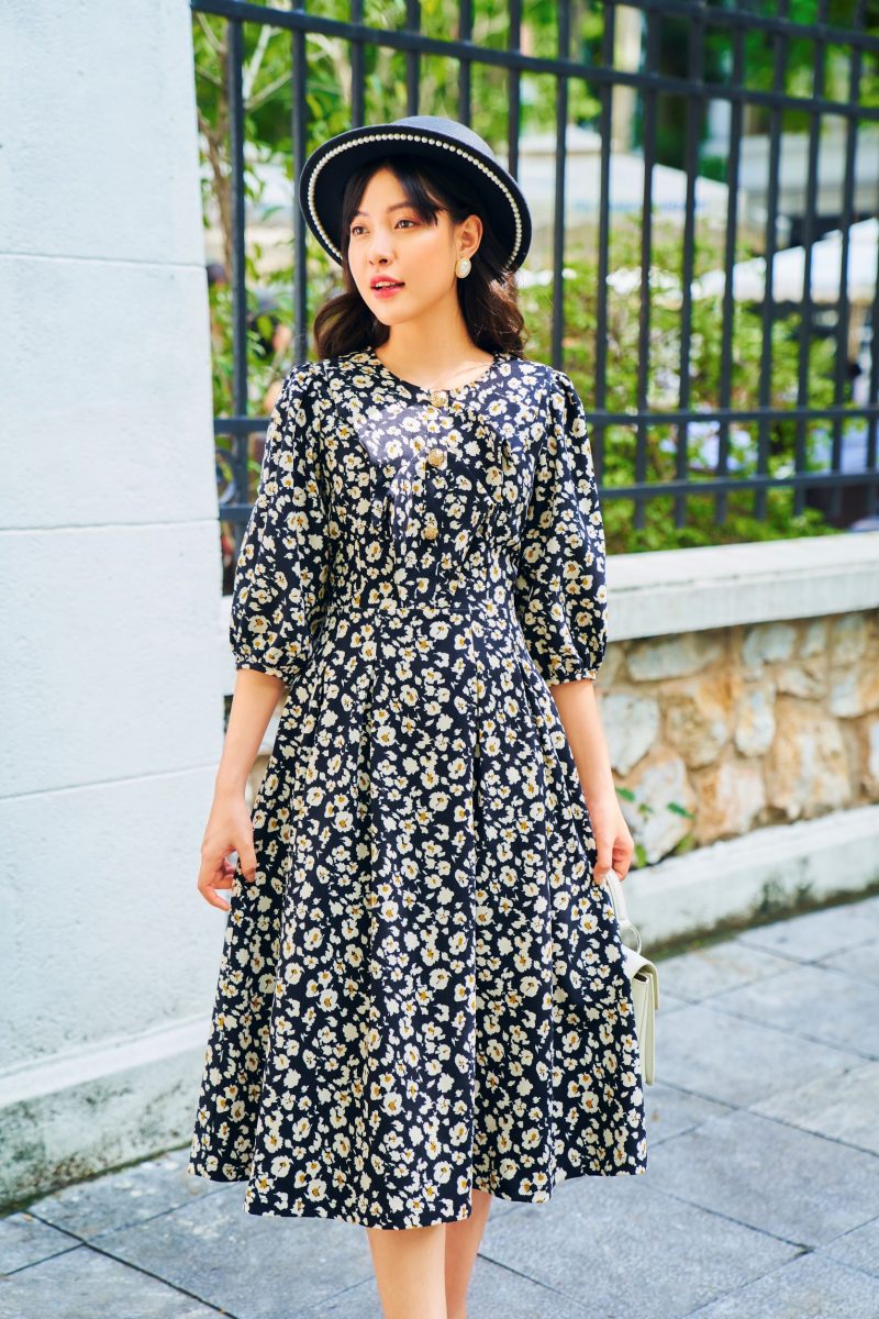 Kiểu dáng: Đầm cổ tròn xếp bèo ngực, dáng váy xòe, có khóa kéo sau lưng